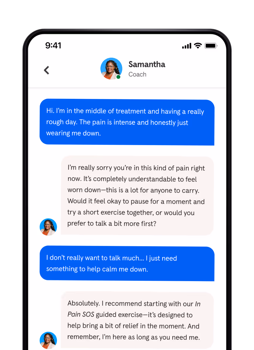 Some moments during cancer treatment can feel especially overwhelming. Maybe it’s the intensity of physical pain, the stress of side effects, or the emotional toll of it all. On those days and all the others — Headspace coaches are just a message away.